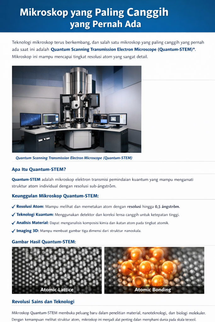 Mikroskop paling canggih yang pernah ada bukan hanya alat pembesar, tetapi jendela menuju dunia atom dan molekul. Dari TEM, STM, hingga AFM dan mikroskop elektron terkoreksi aberasi, teknologi ini telah merevolusi cara manusia memahami materi dan kehidupan. Ke depan, perkembangan mikroskop diperkirakan akan terus mendorong batas ilmu pengetahuan ke tingkat yang lebih luar biasa.